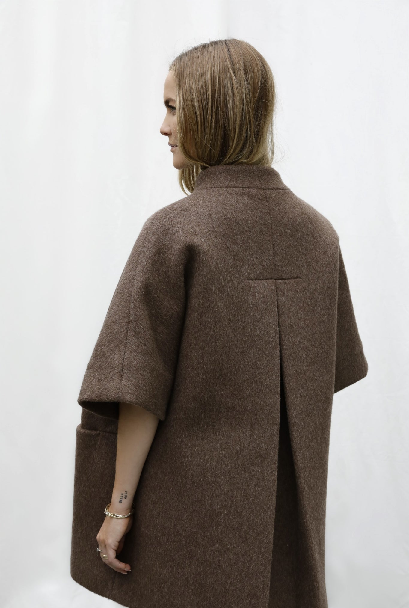 One size wool blend coat with rounded mandarin collar, short wide sleeves. Front pockets and elegant slit on the back. The Mok short coat is designed for an oversized fit, which makes it perfect for layering and complete a chic and comfortable look.